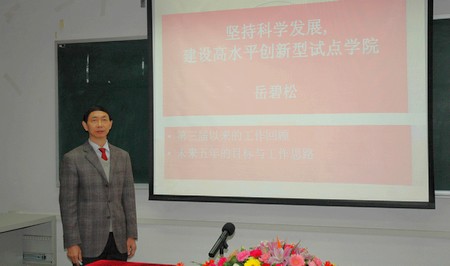 院党委书记岳碧松教授代表学院上一届党委作了题为《坚持科学发展,建设高水平创新型试点学院》的党委工作报告。岳碧松书记在报告中对过去五年来学院的各项工作作了全面的回顾,学院在上届党委的带领下,通过全体师生共同努力,联系实际,立足实践,扎实有效地推进了全院各项工作的顺利开展。报告明确了今后五年的奋斗目标和主要任务,提出了全面提升党建和思想政治工作科学化水平的重要举措。各位代表还审议了学院党委副书记兼纪委书记廖爱民副教授提交审议的上一届纪委的书面工作报告。