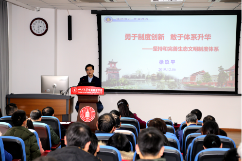 徐玖平教授以“勇于制度创新、敢于体系升华,坚持和完善生态文明制度体系”为题,对党的十九届四中全会及全会审议通过的《中共中央关于坚持和完善中国特色社会主义制度、推进国家治理体系和治理能力现代化若干重大问题的决定》中关于生态文明建设的内容,作了系统阐释和深刻解读。
