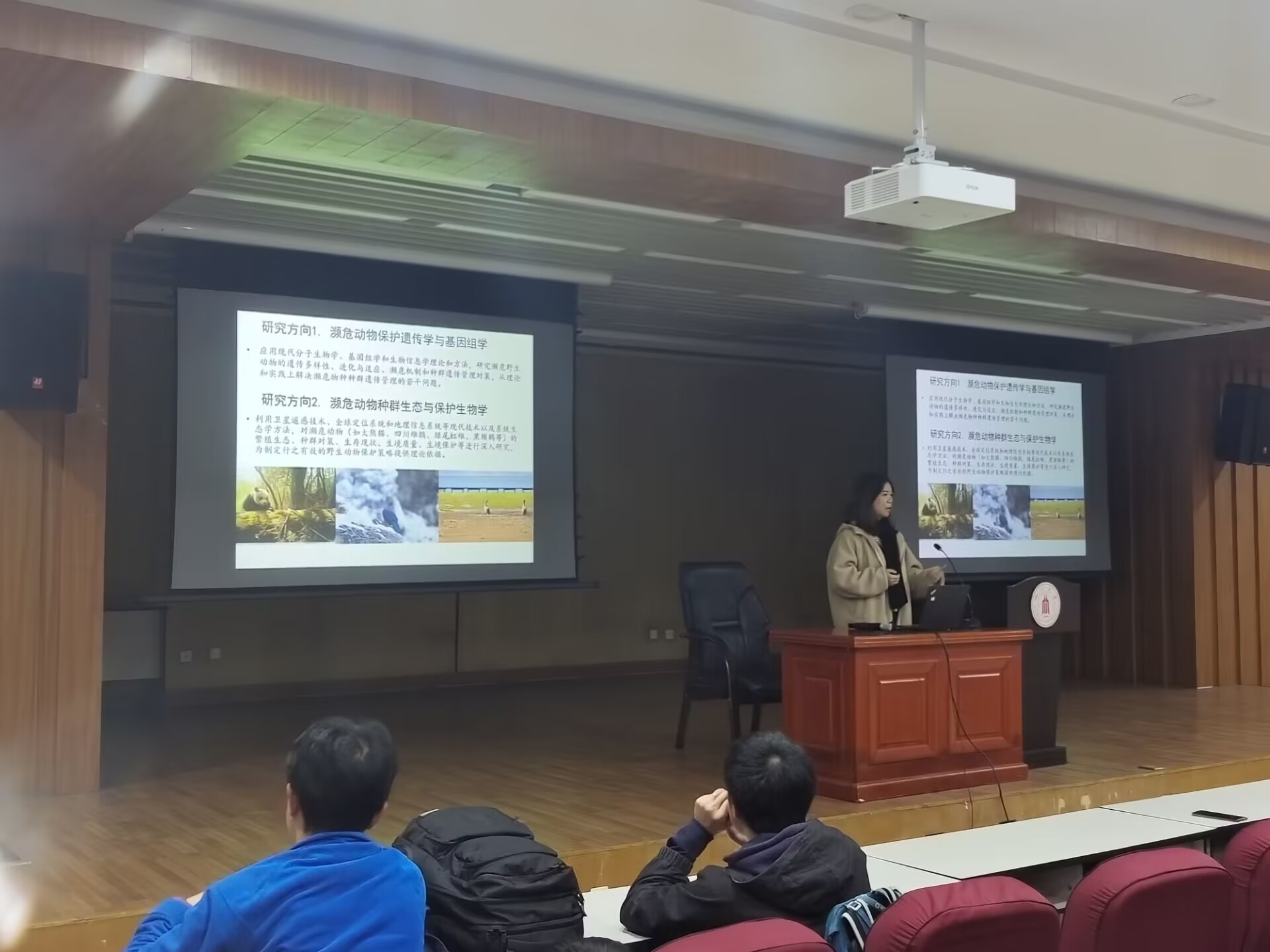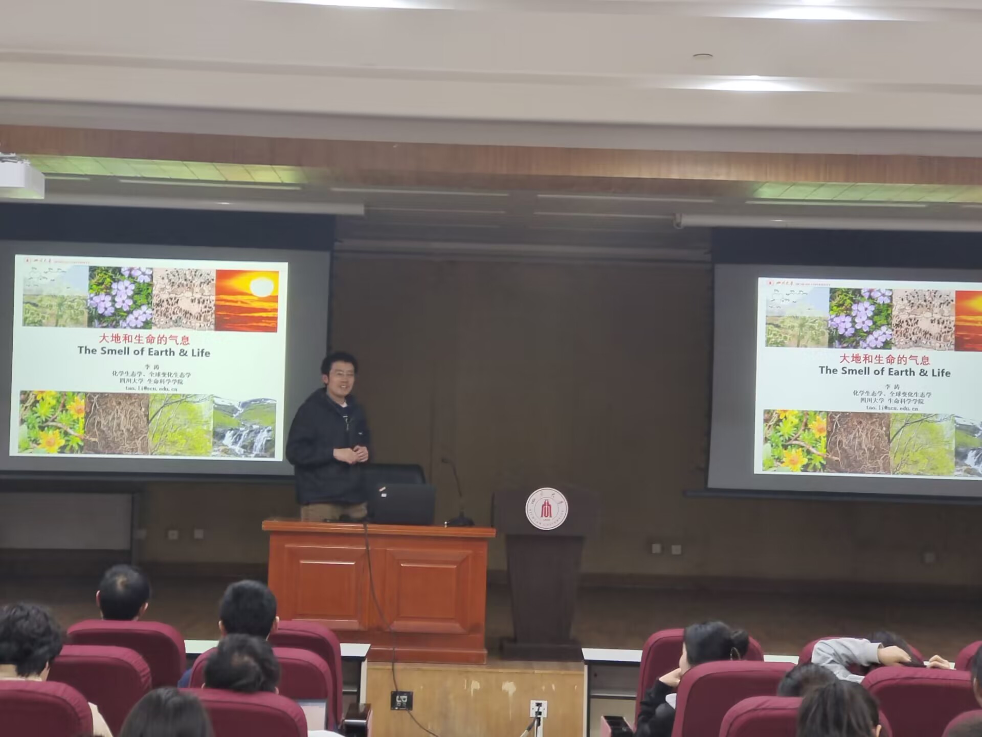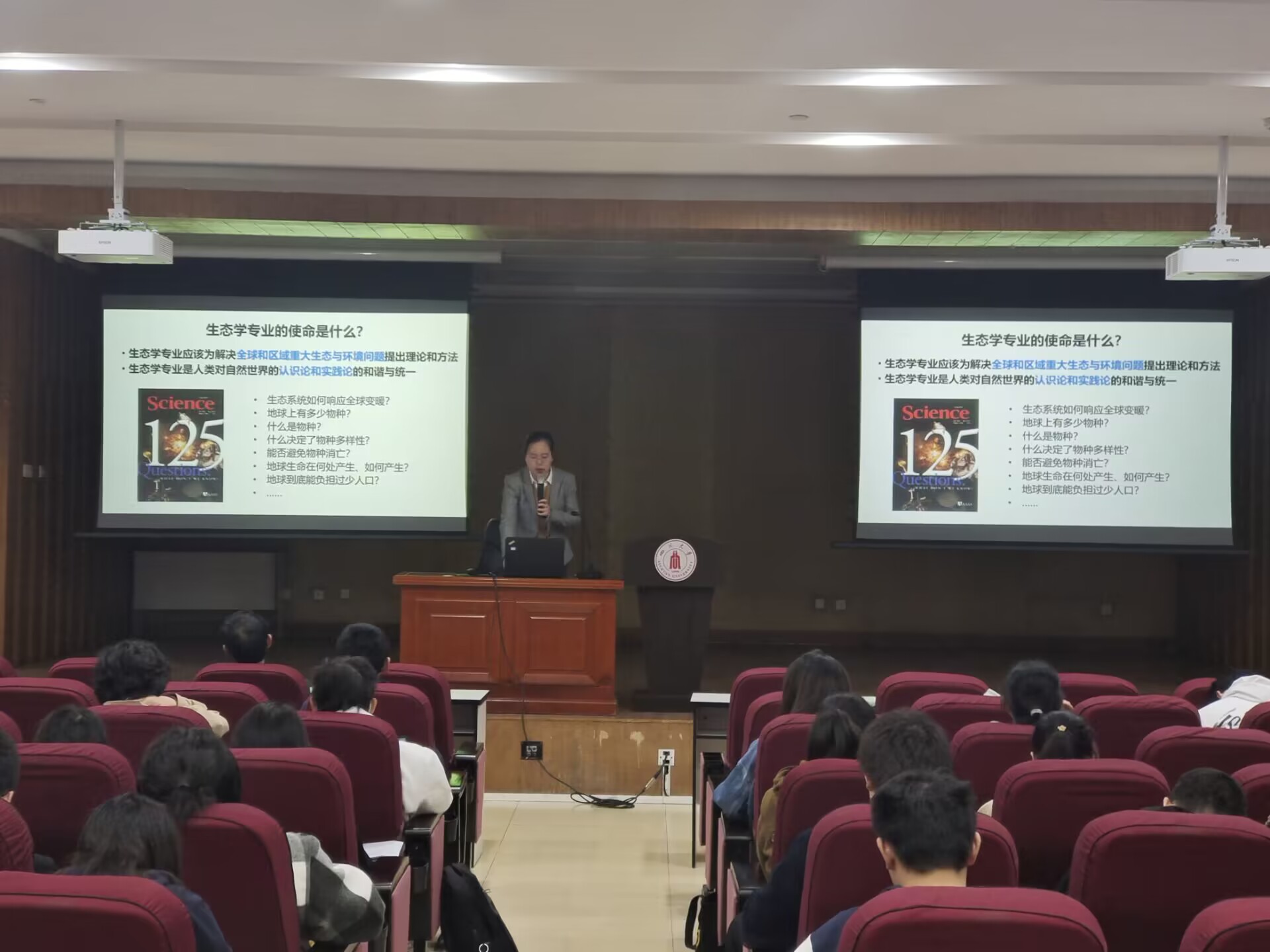 生态系率先宣讲。系主任王婧教授向同学们详细介绍生态系的发展历程,展示生态系老师和同学野外实践的照片,直观感受祖国的大好河山。说到这里,不少同学眼睛里都亮起了光,对大自然的向往加深了大家对学习生态专业的憧憬。