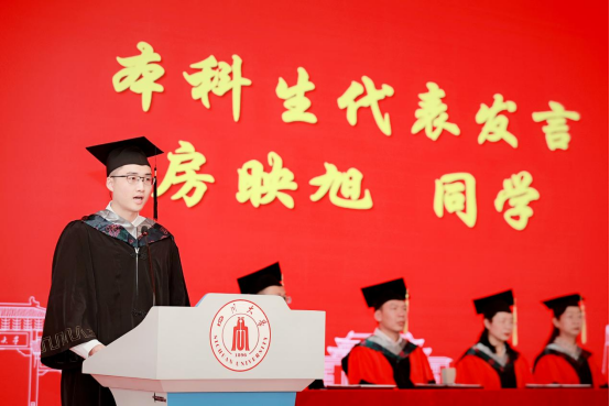 本科生代表,四川省优秀毕业生、威尼斯9499登录入口百佳学生2019级房映旭同学发言,他与在场师生分享了大学四年逐梦川大的日子,与同学们共勉,心怀“孩儿立志出乡关,学不成名誓不还”的志向,谨记学院“志存高远,开拓创新”的教诲,感谢相聚,期待顶峰相会。