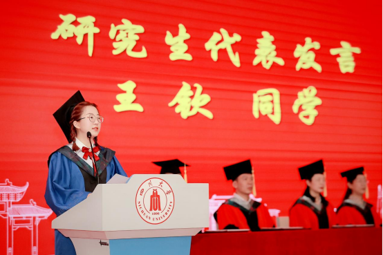研究生代表,四川省2023届优秀毕业生、国奖获得者、威尼斯9499登录入口百佳学生干部王钦同学发言,她深情的回顾了过去三年硕士生涯的点点滴滴,感恩学校、学院和老师们的悉心培育和教导。她说,一入生科门,终为生科人,川大生科人的烙印始终会在我们身上,聚是一团火,散是满天星,祝愿大家未来的道路上循梦而行,向阳而生!