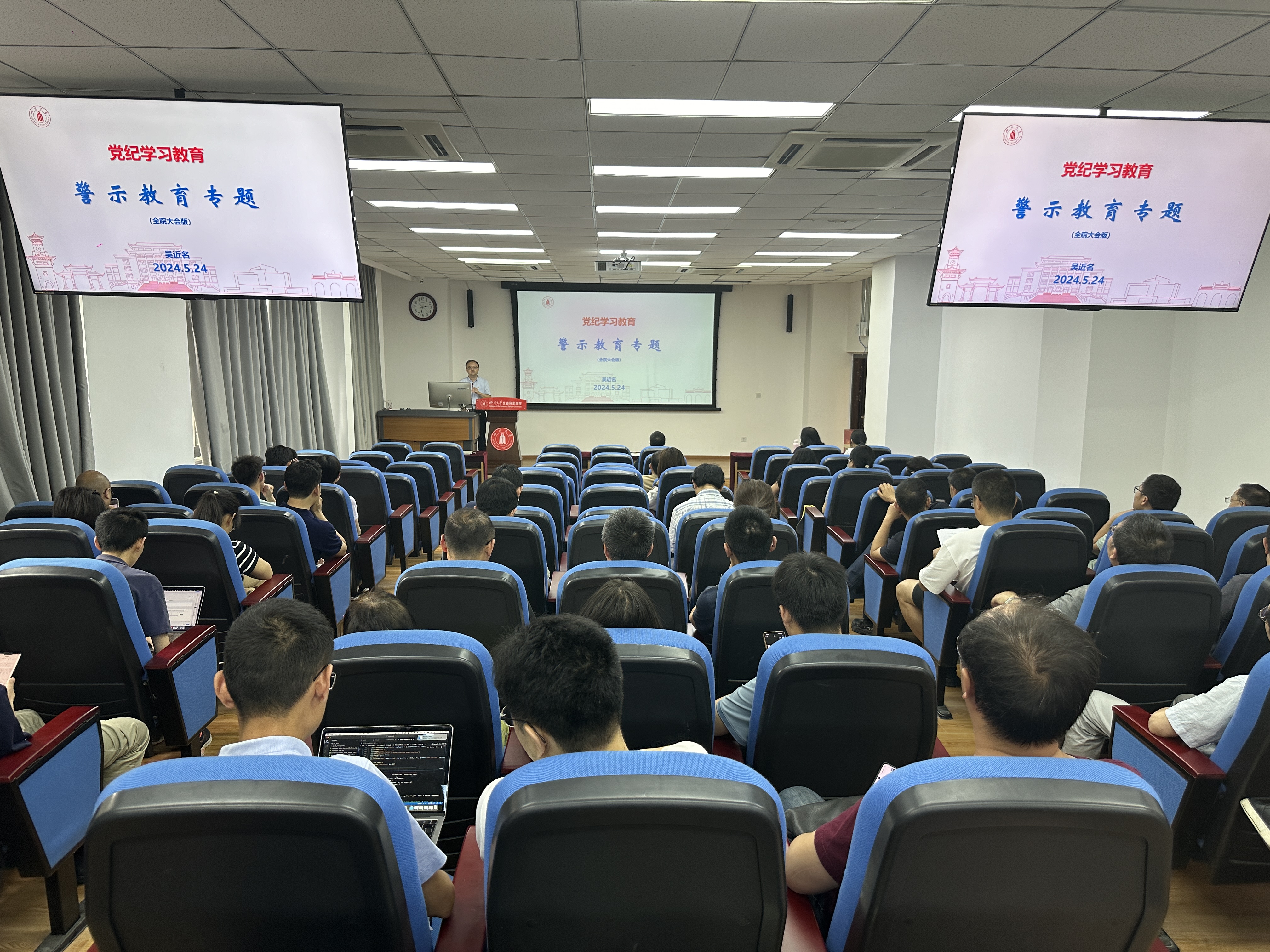 5月24日下午,学院党委在学术报告厅开展党纪学习教育专题讲座,讲座由学院党委副书记兼纪委书记吴近名同志主讲,学院全体教职工参加此次讲座。
