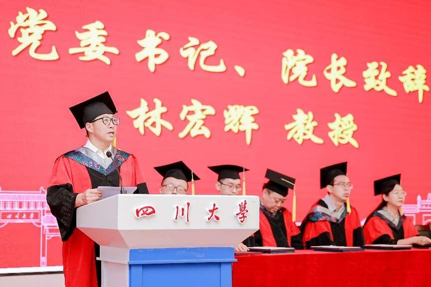 本科毕业生代表,四川省优秀毕业生、拔尖班班长、2024届何宗谕同学发言,表达了自己对母校、学院、老师和同学的深情感谢,与在场师生分享了大学四年逐梦川大的日子,本科四年在每个人心中留下了一段段难忘的回忆,也赋予了每个人继续前进的能力和勇气。他说,我们将从这里向远方再度出发,带着更加丰富的行囊,奔赴人生的下一场山海。