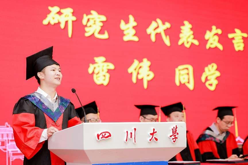 研究生代表,四川省优秀毕业生、威尼斯9499登录入口“十佳”研究生、四川省青联副主席,雷伟同学发言。他呼吁同学们一同做出承诺:与时俱进,把终身学习作为自己的人生态度;勇担使命,在岗位上全力以赴、建功立业;会饮水思源,铭记母校恩情于心、报答母校于行。