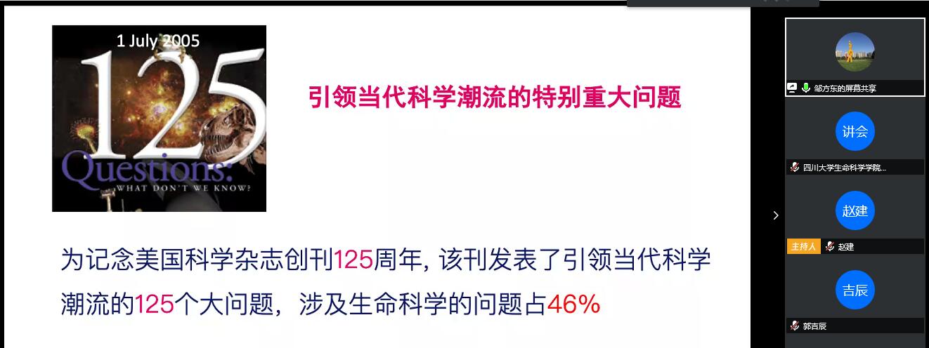 生物科学方向的肖朝文教授结合自身专业选择、科研经历,分享了自己的研究经历;邹方东教授分析了生物科学方向良好的发展前景,具有学生深造率高,后期发展潜力大的特点。邹教授分享的内容中,其中提到为纪念美国科学杂志创刊125周年,该刊发表了引领当代科学潮流的125个大问题,其中涉及生命科学的问题达到46%,这表明生命科学是未来非常有意义的研究领域。欢迎感兴趣的同学们加入共同来研究。