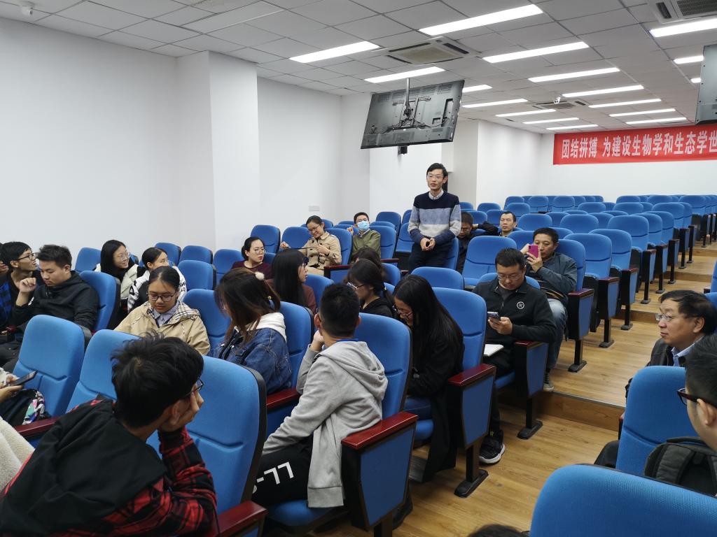 最后环节是各位老师介绍研究方向并结合自己的人生经历对大家的本科学习提出建议。生态系党支部书记张胜教授介绍了自己的研究方向和领域,并向同学们科普了杨树雌雄性别的决定机制和对环境的响应机制差异,欢迎感兴趣的同学加入他的实验室开展科研训练;作为生态专业毕业的师姐,张佩老师告诉同学们生态学确实比大多数的学科有趣,但其道路也是无比艰辛的,建议同学们本科阶段应该不断的学习,掌握课堂上的基本知识,多进入实验室参加科研训练。邓小忠老师则告诉同学们:兴趣是最好的老师;他自己虽从事生态领域的研究几十年,但如今对生态学却越来越好奇,正是这些好奇心激励他不断的学习和探索。缪宁副教授表达了希望与同学们有更多和更好的沟通机会,希望同学们主动寻找更多与老师沟通的机会,今天的见面会就很有意义,为同学和老师的交流提供了一个平台。他还提醒同学们学会与老师交流的方法策略,才能充分的获得老师的指导。王婧研究员用自己生态学的学习经历告诉同学们,选择了这条道路,只要坚定地走下去就会获得成功。余岩副教授讲述了自己的求学和研究经历,由以前经典的植物分类学到现在的计算机编程,他形象地将此比喻为“突变”,让同学们意识到在探索过程中,如果发现自己不适合的研究方向,可以选择转向其它方向。生态系原系主任宋昭彬教授则语重心长又不失幽默风趣地向同学们指出了学习生态学的三大优势,一是党和国家需要,如今生态文明建设不断得到越来越多落实;二是自身需要,通过学习生态学中的种群和群落关系,自然界普遍存在的竞争与合作机制以及野外出差的过程都有利于指导个人的人际交往。在真正学透生态学后,对于人与自然、人与人之间的关系会有全新的看法;三是职业发展的需要,生态学的研究对象多样性高、选择性广,系统全面的观点让具有生态学背景的同学们未来路更宽。李静教授在结束其他会议后,也赶到会场跟同学们分享了自己的学习经验,并期望同学们努力学习,脚踏实地要避免眼高手低,争取在大四毕业时有一个更自信的自己。老师们都热情地欢迎生态专业的同学们,鼓励学生早一点主动进入实验室学习和锻炼,早一点确定自己未来的发展方向。