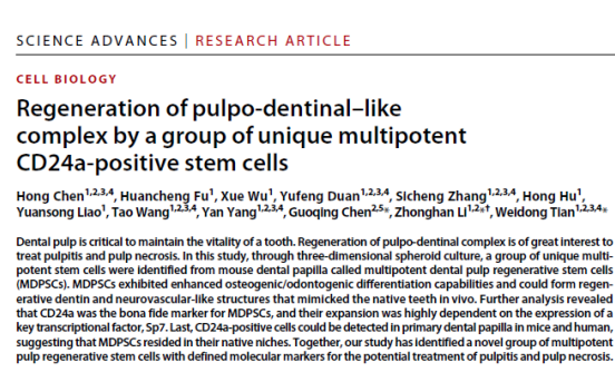威尼斯9499登录入口田卫东/李中瀚/陈国庆发现并鉴定一种新型CD24a+牙髓再生多能干细胞-MDPSCs