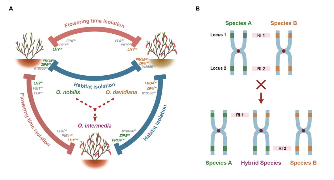 研究人员首先通过自2010年开始的长达八年的同质园实验,并结合相应的体内体外生理实验,评估了虎榛子属物种间的生殖隔离程度。研究发现,虎榛子属三个物种间存在多种类别的强烈(但不完全)的生殖隔离。三个物种都存在明显的合子后生殖隔离;同时也存在合子前生殖隔离:两个亲本物种中,滇虎榛子还具有比虎榛子更强的铁离子耐受性,而虎榛子的花期则明显早于滇虎榛子。有趣的是,同倍体杂交物种居中虎榛子同时继承了其两个亲本物种的合子前生殖隔离相关性状,其铁离子耐受性与滇虎榛子类似,而花期则与虎榛子类似。也正是这一合子前生殖隔离的遗传特性,使得居中虎榛子与虎榛子/滇虎榛子间同时形成了生殖隔离。