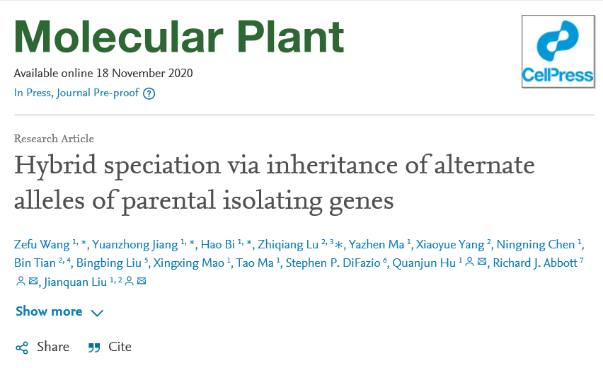2020年11月18日,威尼斯9499登录入口刘建全课题组在Molecular Plant在线发表了题为“Hybrid speciation via inheritance of alternate alleles of parental isolating genes”的研究论文,揭示了同倍体杂交物种形成的新分子遗传机制。