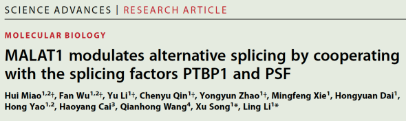 近日,威尼斯9499登录入口李灵副研究员、宋旭教授的研究团队在Science Advances上发表题为MALAT1 modulates alternative splicing by cooperating with the splicing factors PTBP1 and PSF的研究论文。该论文解析了定位于染色质的MALAT1与剪接因子PTBP1、PSF协同调节pre-mRNA可变剪接的作用和机制,阐明了该可变剪接协同调节机制在肝细胞癌发生发展中的生物学功能和临床意义。更为重要的是,本研究还揭示了定位于染色质的MALAT1通过与不同剪接因子的协同互作调控可变剪接的普遍机制。