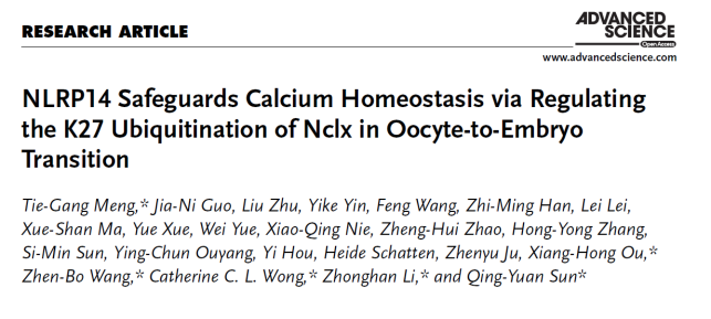 近日,威尼斯9499登录入口李中瀚团队与广东省第二人民医院生殖医学中心的孙青原/欧湘红/孟铁刚团队、北京协和医院黄超兰团队和中国科学院动物研究所王震波团队联合在Advanced Science在线发表了题为“NLRP14 safeguards calcium homeostasis via regulating the K27 ubiquitination of NCLX in oocyte-to-embryo transition”的最新研究成果,首次系统性揭示了胞质定位的母源因子NLRP14与UHRF1协同调控卵子钙稳态和早期胚胎发育,并鉴定出下游调控的唯一关键钙离子通道NCLX(也称为 Slc8b1),为解析母源因子在早期发育中的功能和机制提供了新范式。