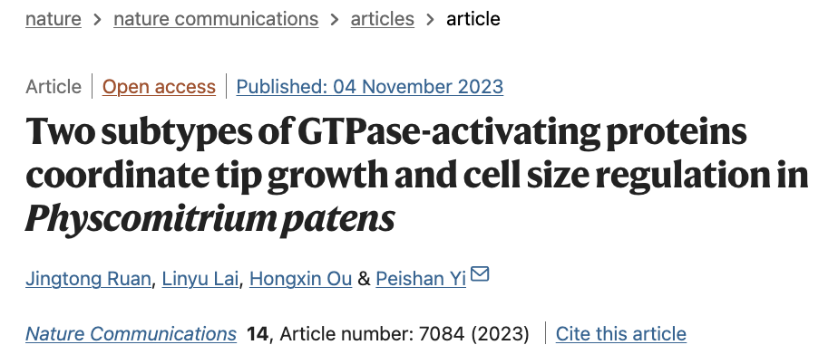 近日,威尼斯9499登录入口易培珊课题组在《Nature Communications》发表题为“Two subtypes of GTPase-activating proteins coordinate tip growth and cell size regulation in Physcomitrium patens”的研究论文,揭示了两类ROP相关GAP蛋白协同调控植物细胞极性生长和细胞形态的新机制。